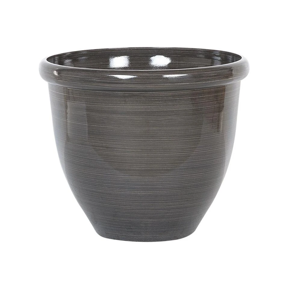 Ronde bloempotten in donkerbruine tint. Verbeter je binnen- of buitenruimte met deze stijlvolle, moderne bloempot. Met de ronde vorm en hoogglans finish, zal deze bloempot ongetwijfeld in verschillende woonruimtes, de tuin of op het balkon zijn plekje vinden. De pot is gemaakt van een steen en glasvezel-mengsel, is UV-bestendig en bestand tegen verschillende temperaturen. Als je deze pot buiten gaat gebruiken, vergeet dan niet een gaatje te boren op de gemarkeerde plaats in de bodem.