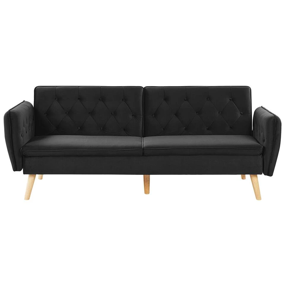 Decoratieve tweezits bank met praktische slaapfunctie. Deze unieke slaapbank is een uitstekende keuze voor iedereen die op zoek is naar functionele en decoratieve meubelstukken. De knoopstiksels geven de zwarte bank een modern en glamoureus karakter, dat nog eens extra wordt benadrukt door de smalle armleuningen en de hoogwaardige fluwelen stof. De brede poten van rubberboomhout staan garant voor veel stabiliteit en zijn prachtig te combineren met alle inrichtingsstijlen van je woonkamer of logeerkamer.