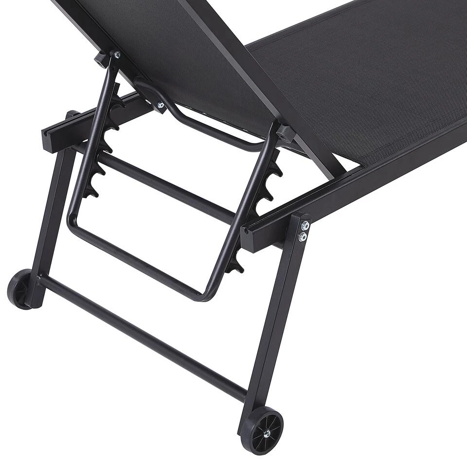 Moderne, verstelbare ligstoel in zwart. Geniet van warme, zonnige dagen in je tuin of terras op dit praktische ligbed. Dankzij de verstelbare rugleuning kun je de hoogte van de ligstoel aanpassen aan jouw behoeften. Hierdoor kun je comfortabel zitten en ontspannen terwijl je een interessant boek leest of gewoon gaat liggen zonnebaden. De constructie van de lounger is gemaakt van hoogwaardig en lichtgewicht aluminium, wat in combinatie met ingebouwde wielen ervoor zorgt dat dit tuinbed bijzonder gemakkelijk te verplaatsen is. Het synthetische materiaal dat voor deze ligstoel is gebruikt, is extreem duurzaam en vereist minimale zorg terwijl het tegelijkertijd de moderne uitstraling van het stuk benadrukt.
