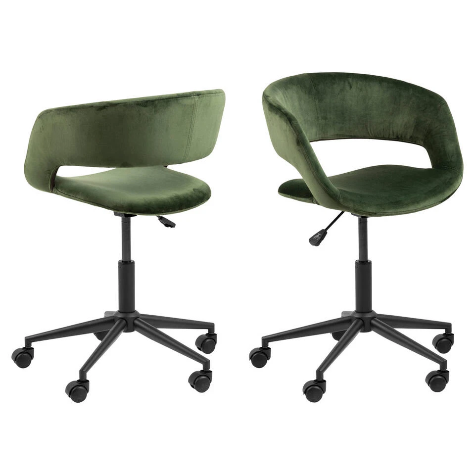 Deze bureaustoel Gizem heeft een moderne en trendy look. Het leuke kuipstoeltje is bekleed met zacht fluweel in de kleur groen. De stoel heeft een comfortabele zit. is in hoogte verstelbaar en is verrijdbaar.