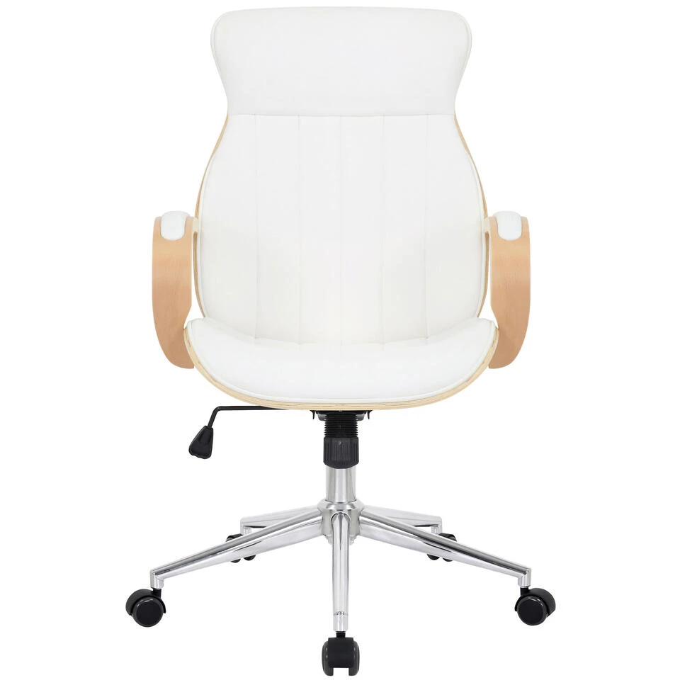 Deze bureaustoel heeft een zeer hoogwaardige kunstlederen bekleding. De kunstlederen hoes heeft het voordeel dat hij elastisch is en weer glad worden als ze ontlast worden. Dit ziet er niet alleen mooier uit, maar verlengt ook de levensduur van de stoelbekleding. Het houten frame maakt deze bureaustoel tot een absolute blikvanger en geeft hem een nobel design. Dankzij de traploze zithoogte is ergonomisch zitten gegarandeerd en zorgt het ingebouwde kantelmechanisme voor meer bewegingsvrijheid. Het frame is gemaakt van metaal in chroomlook en is zeer stabiel. De bureaustoel staat stevig op vijf zwenkwielen.