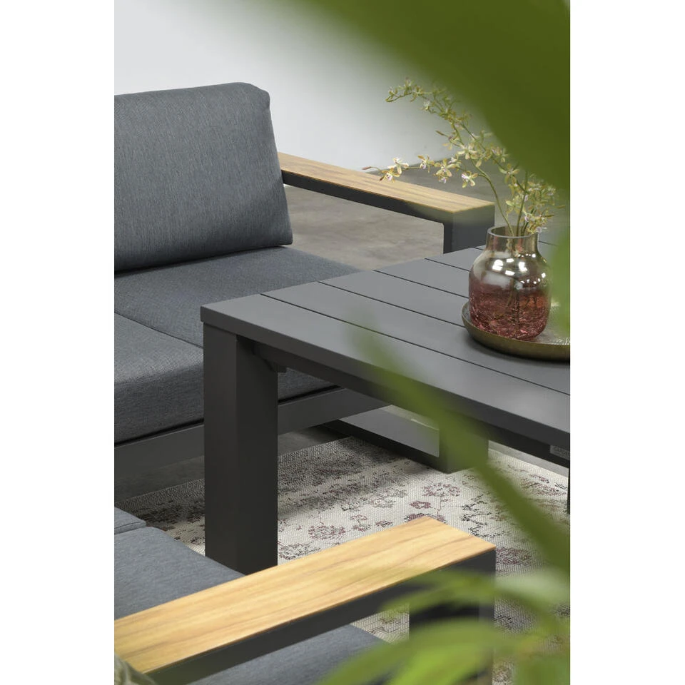 Deze volledige aluminium loungeset in de kleuren donker grijs en teak wordt geleverd met comfortabele kussens. De brede armleuningen zorgen voor een robuuste look. De hoge tuintafel is volledig gemaakt van aluminium met een stevige coating. Deze complete loungeset is gemaakt van een onderhoudsvrij en weerbestendig aluminium frame met een stevige poedercoating. Deze laag zorgt ervoor dat het frame kras- en stootvast is. De meegeleverde kussens zijn gemaakt van een hoogwaardige kwaliteit polyester.
