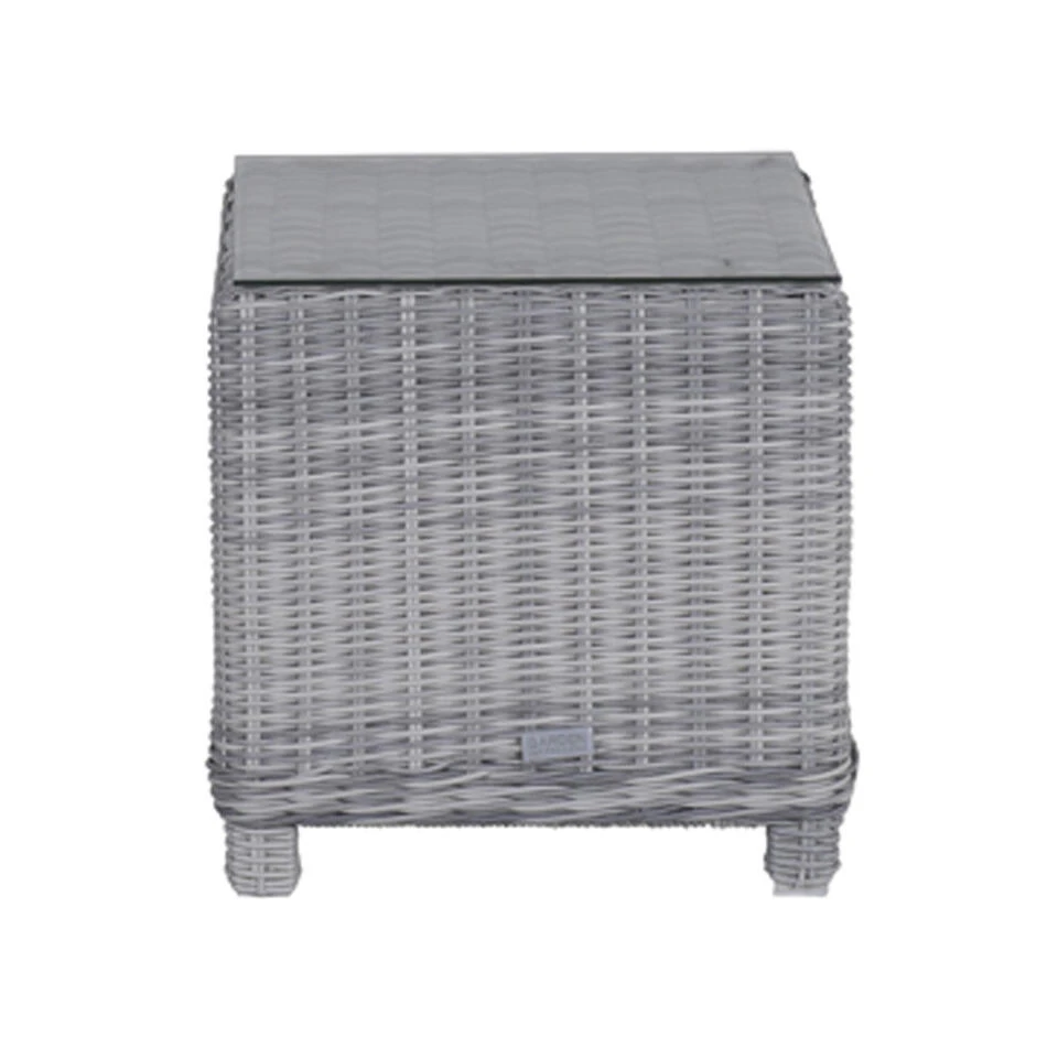 Handig Santa Rosa bijzettafeltje 45 x 45 x H46 cm met stevig aluminium frame, met daar omheen 5mm cloudy grey kleurig halfrond vlechtwerk draad. Dit bijzettafeltje met heldere glasplaat past mooi bij de verstelbare relax fauteuil en voetenbank in hetzelfde vlechtwerk. Een uitgebreide collectie bijzettafels vind je binnen de categorie tuinmeubelen. Tuinmeubelen van verschillende mooie merken.