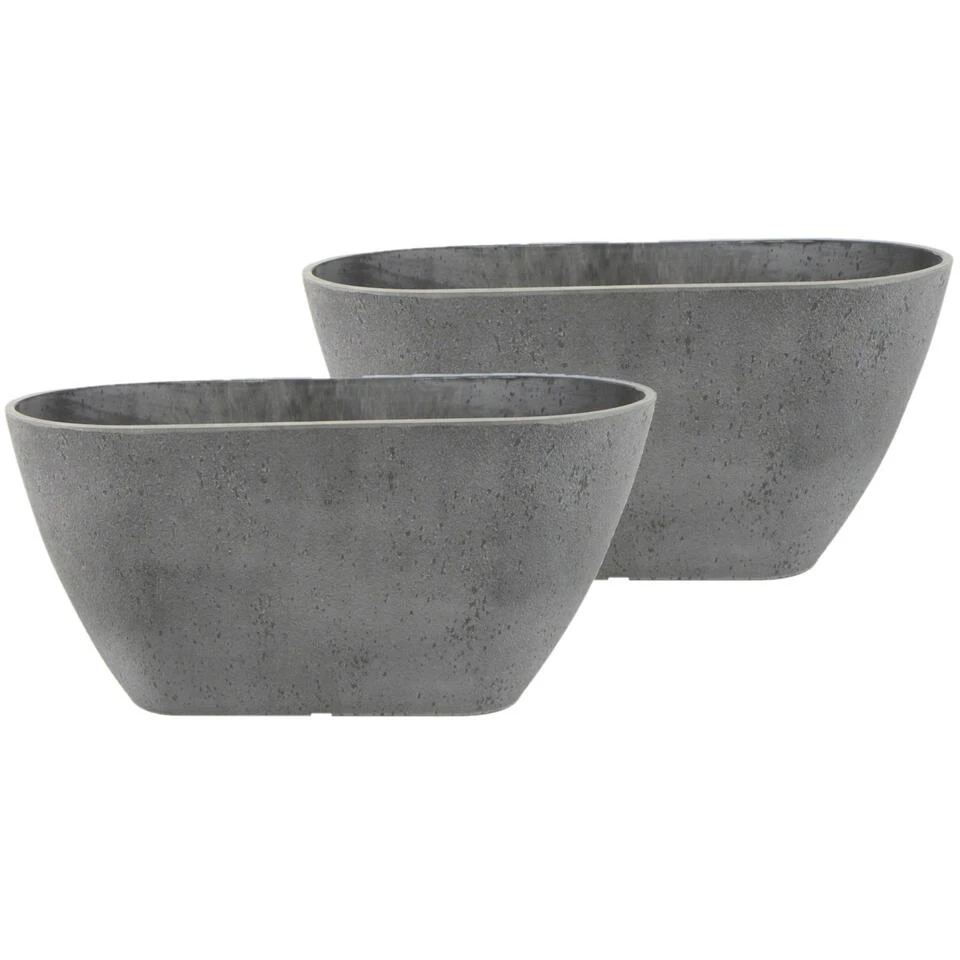 Bloempot/plantenpot balkonbak van gerecycled kunststof en steenpoeder in de kleur donkergrijs met diameter 36 x 16 cm en hoogte 16 cm. Potten voor buitenplanten of kunstplanten. Deze plantenpot voor buiten heeft een stijlvolle uitstraling. Een unieke duurzame mix van materialen dat nu geen afval is, maar een prachtige duurzame bloempot. Een sterke, mooie pot die vriendelijk is voor het milieu en de portemonnee. De pot heeft gaatjes in de onderkant dus een opvangbalkonbak is voor binnen gebruik vereist. Zoeknaam serie voor de balkonbak is Nova concrete donkergrijs. Deze serie potten hebben een eigen drainagesysteem onderin de pot.