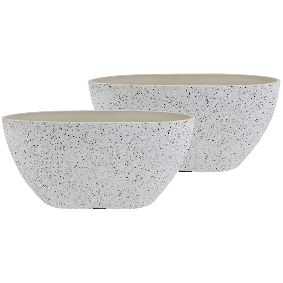 Bloempot/plantenpot balkonbak van gerecycled kunststof en steenpoeder in de kleur wit met diameter 36 x 16 cm en hoogte 16 cm. Potten voor buitenplanten of kunstplanten. Deze plantenpot voor buiten heeft een stijlvolle uitstraling. Een unieke duurzame mix van materialen dat nu geen afval is, maar een prachtige duurzame bloempot. Een sterke, mooie pot die vriendelijk is voor het milieu en de portemonnee. De pot heeft gaatjes in de onderkant dus een opvangbalkonbak is voor binnen gebruik vereist. Zoeknaam serie voor de balkonbak is Nova concrete wit. Deze serie potten hebben een eigen drainagesysteem onderin de pot.